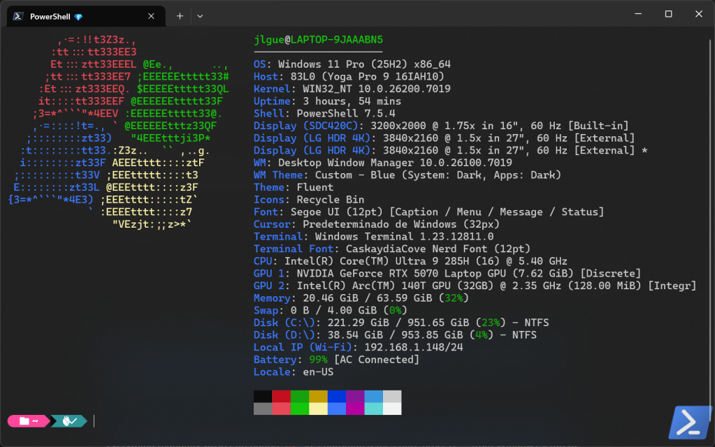 Last week I received my new Yoga Pro 9 16IAH10 – Type 83L0 (specs here), and of course… installing everything manually wasn’t an option 😅. So, I automated the entire process — from Windows setup to terminal styling — using PowerShell and a few carefully crafted scripts.