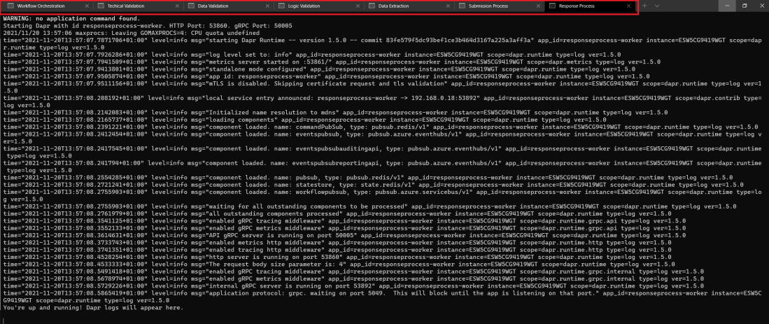 Ejemplo de ejecucíon de distintos Microservidios Dapr A modo de tip, hoy quiero comentar una simple pero potente ventaja de la Windows Terminal, en concreto, poder ejecutar varios procesos en una misma ventana. Bien con diferentes tabs, o bien con distintas secciones/divisiones. En particular, en el ejemplo de la imagen anterior, podemos ver la ejecución … Sigue leyendo [TIP] Script para lanzar multiples procesos en una misma «Windows Terminal»